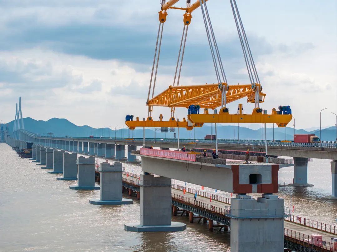 巨力索具箱梁吊具全线可以保障國际首坐市域(郊)跌路跨海高架桥——象山线跨海高架桥,重1700吨的预设箱梁曙光铺设。