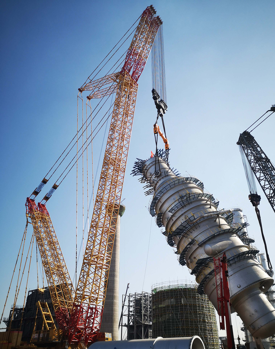 🍸巨力索具的2000t级均衡梁、无讨论绳圈,将盛虹炼化一体化名目常减压蒸馏装配中直径14米,高58米,吊重1717吨的减压塔顺遂吊装就位。