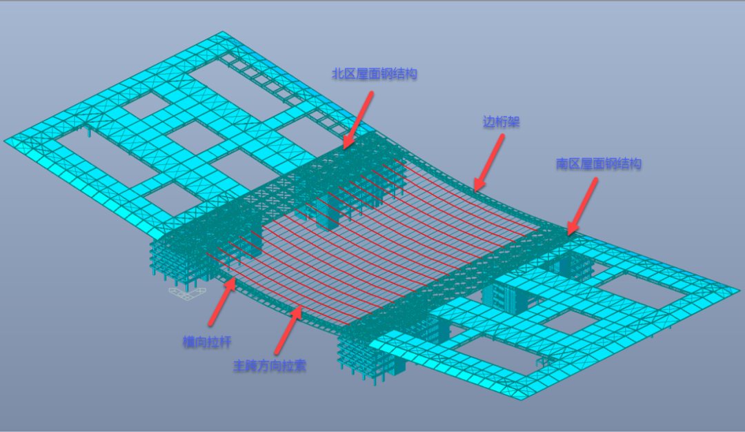 就拿高难度的拉索装置来讲,矢高约3.5米的超大弧形悬索钢屋盖,每榀桁架起吊后,须要找到最适合的角度做成倾斜状况。此中最长的桁架,持续跨度可达120米摆布。大屋面由“双向钢桁架+跨中拉索布局”构成,中心地区110米全悬空的悬链态由两侧边桁架及中心36根直径为70毫米的不锈钢拉索构成,施工牵引张拉、精度、温度、双索的歪曲偏转是无可躲避的困难。